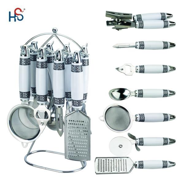 Composition: | 1pc can opener, 1pc peeler, 1x bottle opener, 1x tea strainer, 1x ice-cream spoon, 1xgrater, 1x pizza cutter |